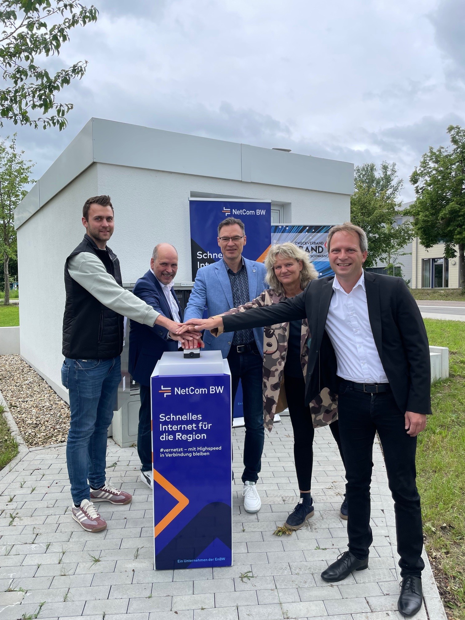 Um gemeinsam zu feiern, dass Kirchberg a. d. Jagst nun offiziell an das Glasfasernetz geht, trafen sich Anfang Juni die Vertreter:innen der Stadt, dem Zweckverband Breitband, des Ingenieurbüros GEO DATA aus Westhausen und dem Netzbetreiber NetCom BW in der Nähe der Schloßschule.