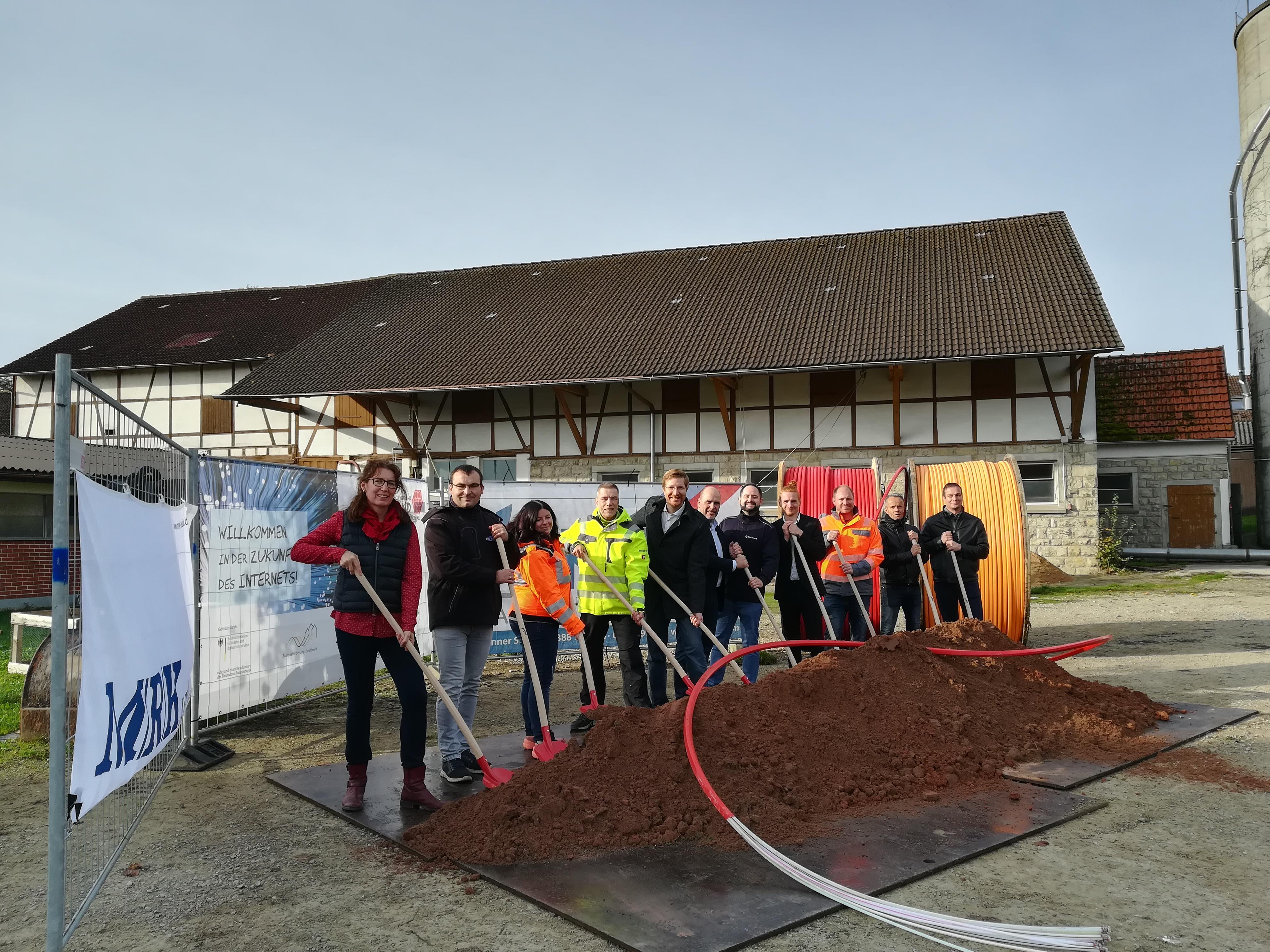 Mit nagelneuen roten Spaten ausgestattet lässt sich der Baubeginn angemessen zelebrieren: (v. l.): ) Lydia Renner (Teilortsanwältin und Besitzerin der Örtlichkeit), Raphael Reichert (Bauleitung Zweckverband Breitband), Monika Sieber (Bauleiterin KTS Bau), Dirk Hintz (Projektingenieur MRK Media AG), Bürgermeister Christian Mauch, Heinz Kastenholz (Geschäftsführer Zweckverband Breitband), Michael Mai (NetCom BW), Benjamin Voss (Leiter Projektträger Bundesförderung, TÜV Rheinland), Michael Sieber (Bauleiter KTS Bau), Kay Sautter (Bauamtsleiter) und Marcus Nimrichter (Bauamt)